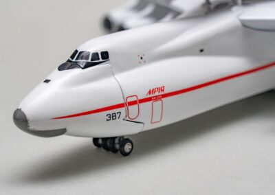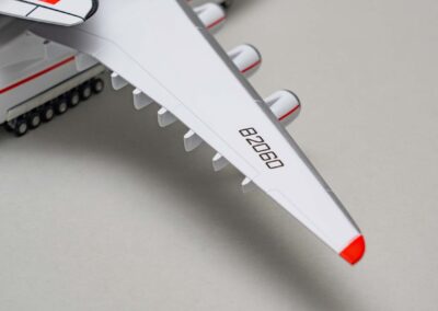 Tento model legendárního letadla Antonov An-225 Mriya představuje zmenšeninu největšího dopravního letadla, které kdy vzlétlo. Vyroben je z pryskyřice (resin cast model) a nabízí velmi kvalitní zpracování s důrazem na věrné proporce a realistický vzhled. Povrch modelu zachycuje typické zbarvení společnosti Antonov Airlines s modro-žlutými pruhy, které se staly symbolem ukrajinského letectví. Letadlo je dodáváno rozložené v krabici. Montáž je jednoduchá, nevyžaduje žádné lepení.Díky své velikosti a přesnému tvarování působí jako reprezentativní doplněk pro každého milovníka letectví. Rozpětí je 45 cm, délka 43 cm a výška na stojánku je 20 cm (na kolečkách 16 cm).